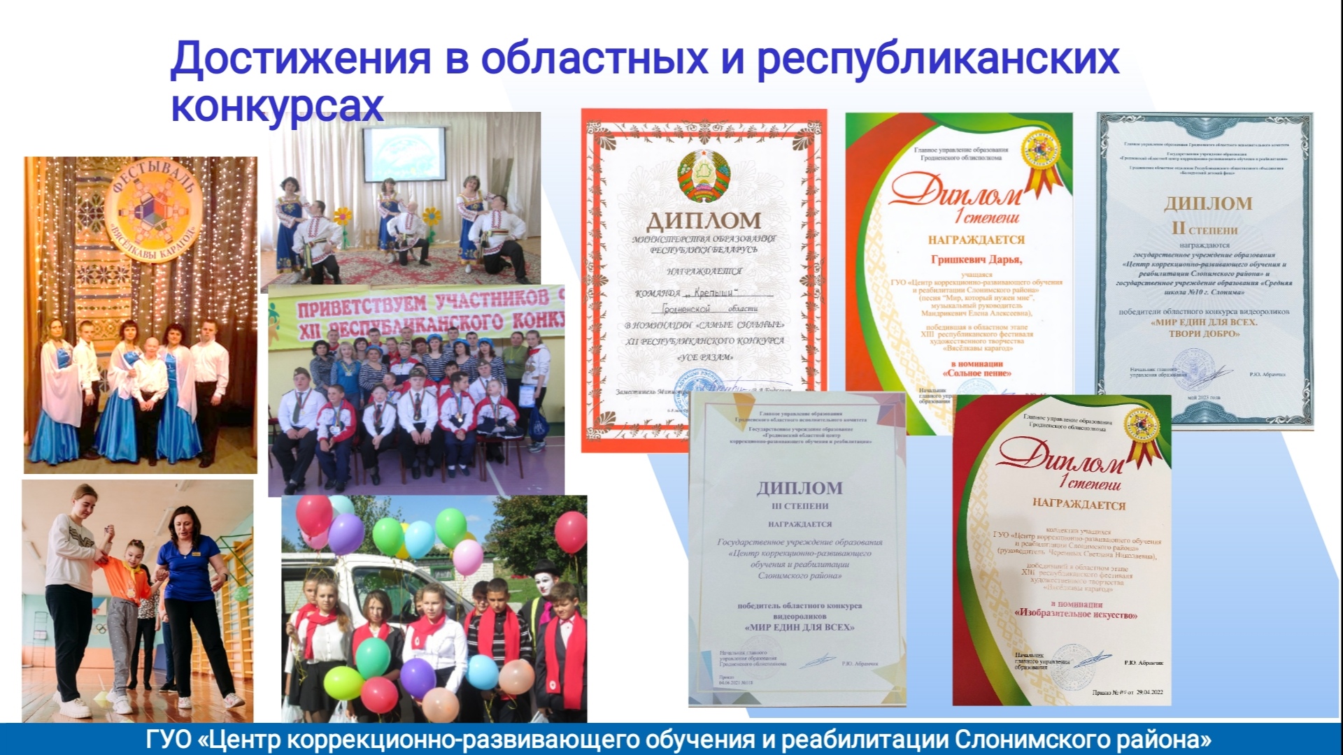 Дипломом1 степени награждены учащиеся Тарашкевич Иван, Пташник Павел, Мороз Артем, художественный руководитель Волосевич Лариса Петровна, в номинации «Эстрадный танец» в областном этапе XIVреспубликанского фестиваля художественного творчества «Вяселкавы карагод» главного управления Гродненского облисполкома, апрель 2025 года.