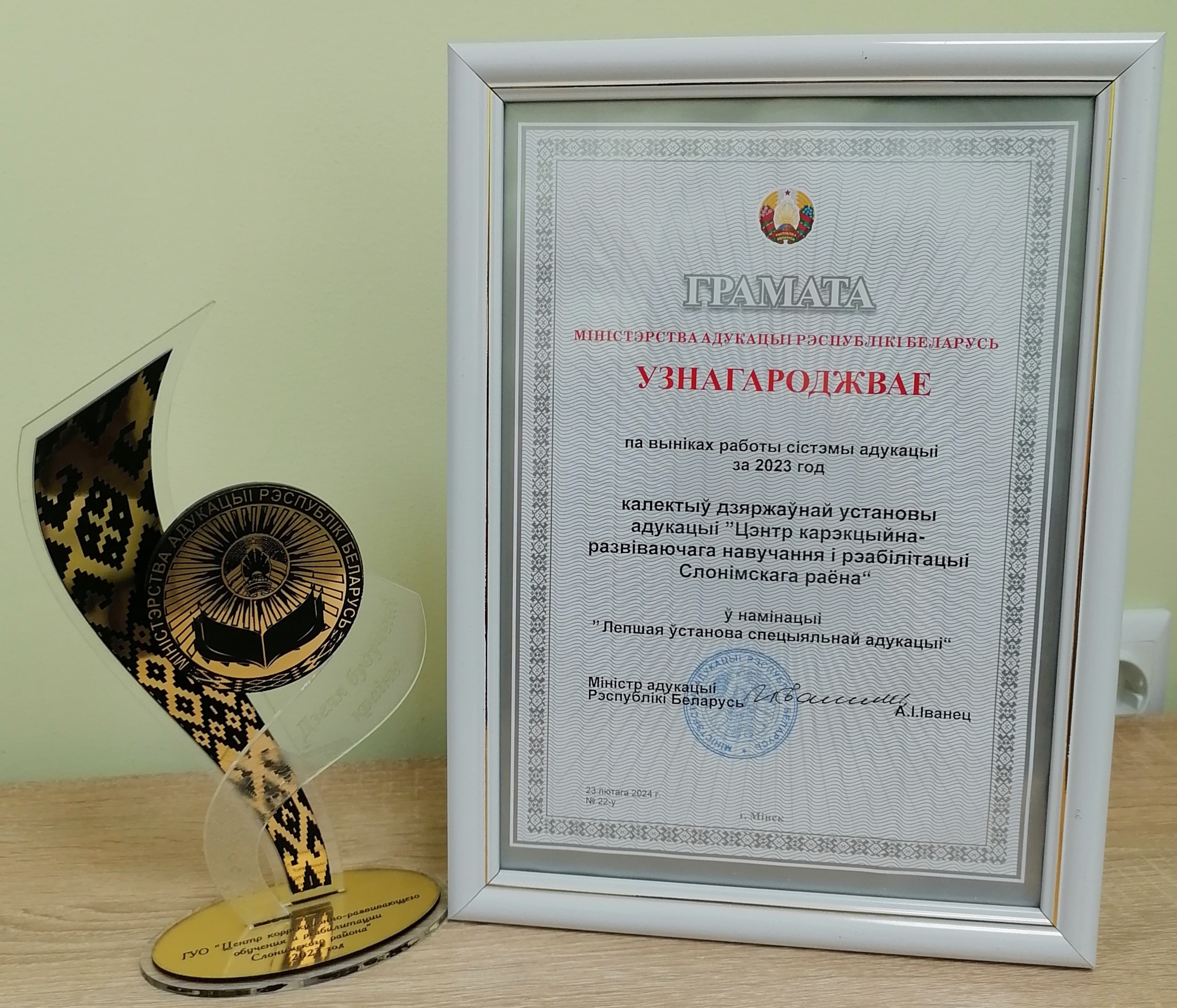 Грамота Министерства образования Республики Беларусь в номинации «Лучшее учреждение специального образования» по результатам работы системы образования за 2023 год.