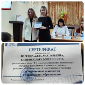 В ходе семинара был вручен сертификат участникам областного этапа ІХ республиканского конкурса «Современные технологии в специальном образовании» учетелям-дефектологам нашего учреждения Варгиной Алле Анатольевна и Клыбик Ольге Михайловне.